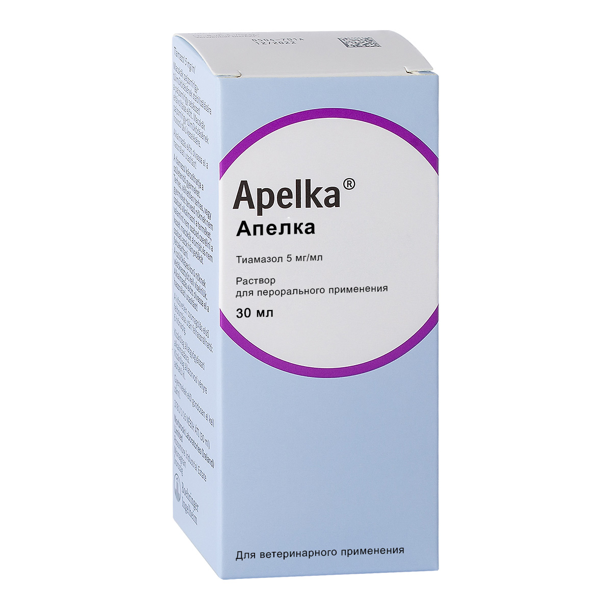 Apelka / Апелка 30 мл – ветеринарное средство для лечения гипертиреоза у кошек и собак, у животных с проблемами щитовидной железы после проведения диагностических исследований. Препарат продаётся в форме раствора для перорального применения, возможен длительный период терапии или назначение лекарства для стабилизации состояния питомца. Активное вещество тиамазол - для кошек в начальной дозе назначается по 5 мг в сутки, соответственно необходимо отмерить 5 мл раствора Апелка на один день. Суточную дозу делят на два приёма и дают животному отдельно от пищи, чтобы не снизить эффективность действия препарата, основанного на блокировке биосинтеза гормонов щитовидки.